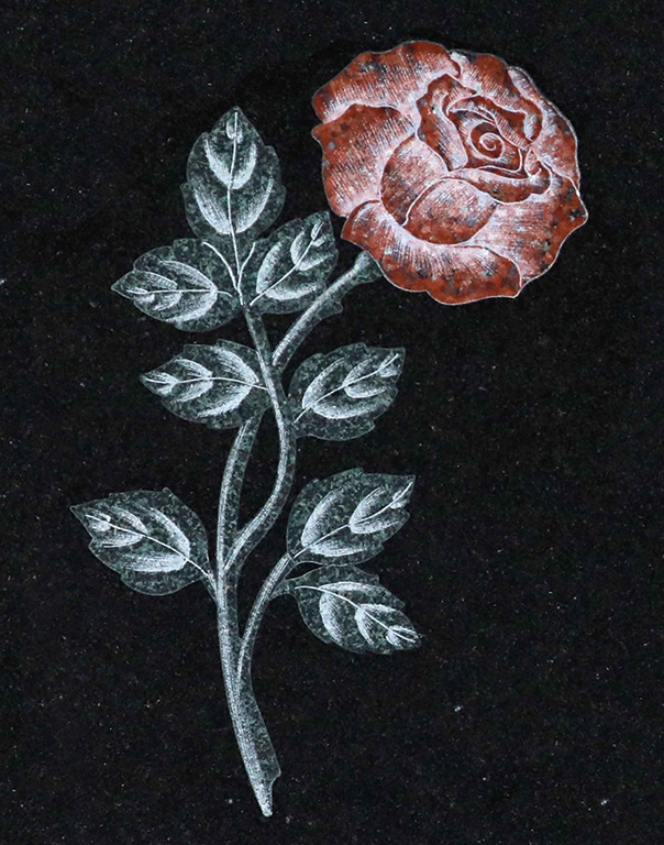 - Intarsiadekorer skapas genom att bitar av granit eller marmor limmas in i stenen som ett pussel. Därefter poleras hela gravstenen och intarsian skugghuggs för djup och dimension.